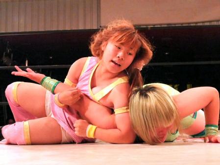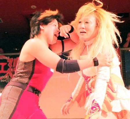 タッグ2冠王座2度目の防衛に成功した米山香織(左)とさくらえみ=大阪ミナミムーブオンアリーナ