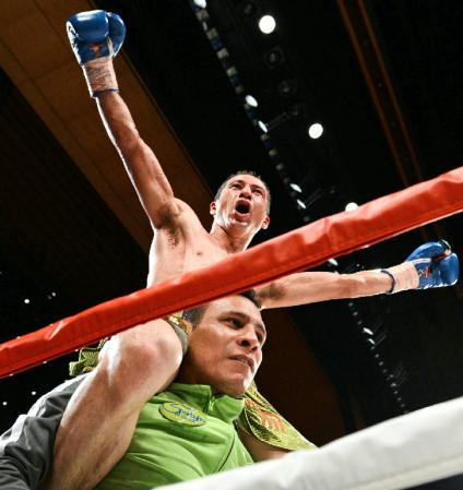 6R、ガマリエル・ディアスに粟生隆寛の左ストレートがヒット=東京国際フォーラム(撮影・三好信也)