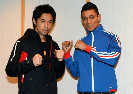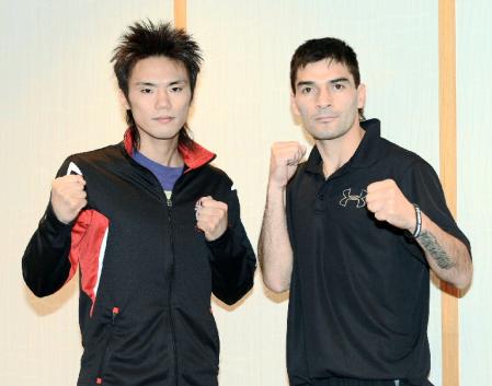 トマス・ロハス(左)の腹筋をチェックする山中慎介=ホテルグランドパレス(撮影・棚橋慶太)