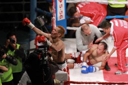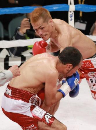 山下会長に飛びつき喜ぶマルコム・ツニャカオ(撮影・神子素慎一)