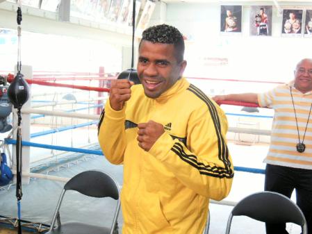 ファイティングポーズを決めるリボリオ・ソリス=東京都品川区のワタナベジム