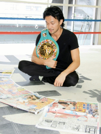 一夜明け会見でガッツポーズを見せる山中慎介=東京・神楽坂の帝拳ジム