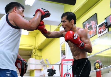リラックスムードに包まれたクワンタイの公開練習=大阪市内の井岡ジム