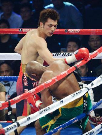 4回、カルロス・ナシメントにTKO勝ちした村田諒太=マカオ(共同)