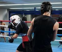 スパーリングを行った東洋太平洋ライト級王者・中谷正義(左)と日本同級1位・鈴木悠平=真正ジム