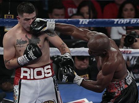 WBO世界ウエルター級タイトル戦が7日(日本時間8日)、米ネバダ州ラスベガスのトーマス&マックセンターで開催され、王者ティモシー・ブラッドリー(米国)が9回に挑戦者ブランドン・リオス(米国)からボディブローで2度のダウンを奪い、この回2分49秒でTKO勝ちを収めた。