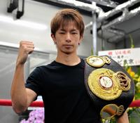 激戦から一夜明け、ベルトを手にポーズをとる田口良一(撮影・西岡正)