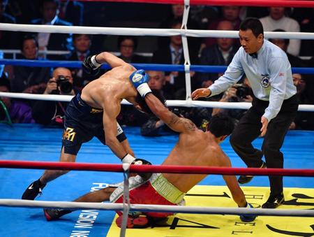 勝負が決まったのは第3R。ロープを背にした相手に対し、村田の“黄金の右”がさく裂。村田ともつれるように前に崩れ落ちたブルーノは、立ち上がろうと試みたが、試合続行は不可能と判断された。