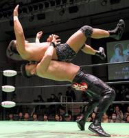 杉浦(左)に強烈なエルボーを叩き込む谷口
