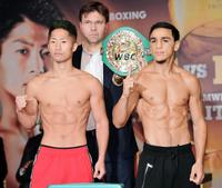 計量を終え、にらみ合う井上拓真(左)とウーバーリ=東京都千代田区のホテルグランドパレス(撮影・出月俊成)