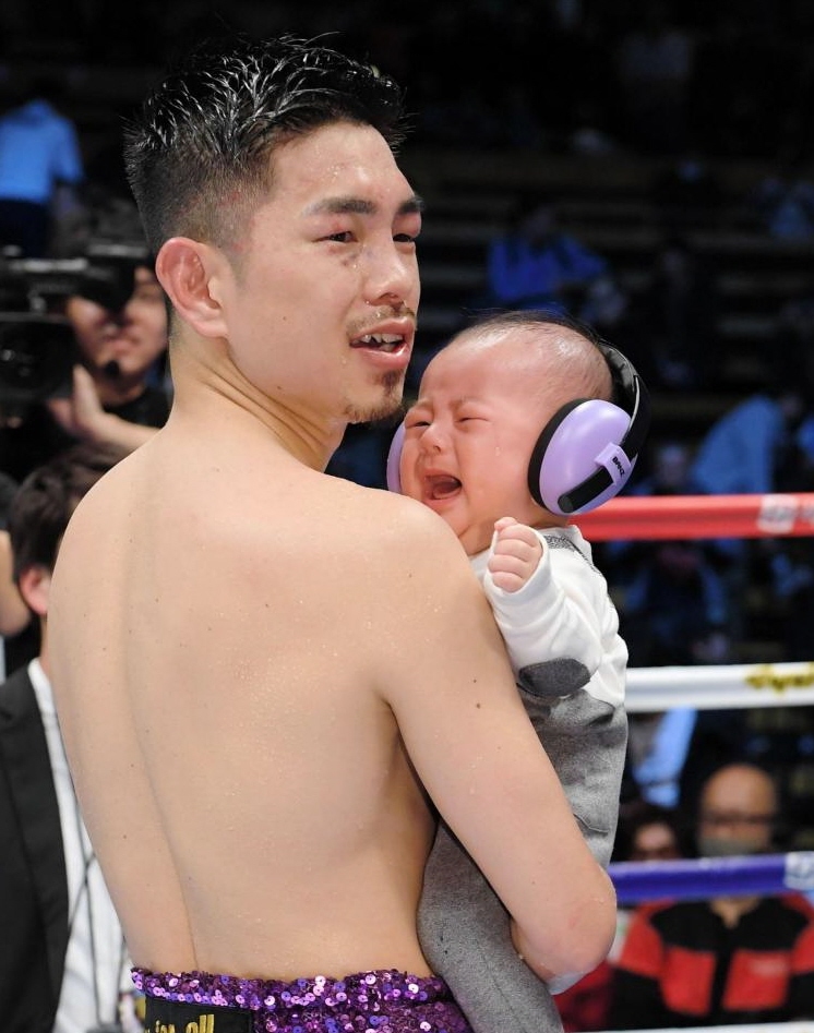 井岡初防衛 勝利のリングに8月誕生の長男・磨永翔くんイヤーマフ着けて登場