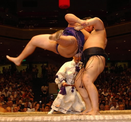 03年の9月13日(秋場所6日目)に朝青龍が放った豪快なバックドロップ(本当の決まり手は「つり落とし」)。横綱としての品格はともかく、実力・トーク力は間違いなくプロレス向き。ちなみにこの時期の朝青龍、バックドロップにハマッていたのか、次の九州場所前の稽古でも高見盛相手に繰り出して右肩を負傷させていた。