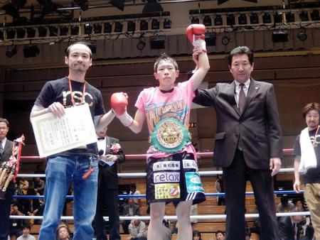 ゴングが鳴っても戦意を失い立ち上がれない王者。その瞬間、国内4人目の3階級制覇を達成。王者は顔面骨折の疑いで試合後、病院送りとなった。