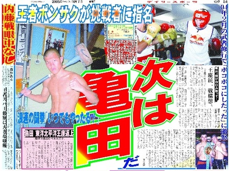 【2005年10月7日デイリースポーツ紙面より】 王者ポンサクレックが6日、内藤戦後のV13戦の相手に亀田興毅(18)=協栄=を指名した。(中略)「内藤に勝ったら次は亀田とやる。亀田と以前にスパーリングをやったが、俺をボコボコにしたと言っているらしいから、リングで分からせてやる」。いつもは笑みを絶やさない温和な王者が、せきを切ったようにまくし立てた。(中略)宿敵からの挑戦状を聞いた“浪速の闘拳”は「ボコボコやったやんか。チャンピオンやったらスパーでも負けるなよ。ほんまかっこ悪いわ」と世界王者をメッタ切りにした。