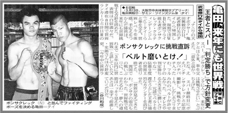 【2004年2月18日デイリースポーツ紙面より】 亀田興毅が17日、武者修行先のタイから帰国した。現地ではWBC世界フライ級王者ポンサクレック・クラティンデーンジム(26)=タイ=らと拳を交えた。滞在8日間でポンサクレックとは5R、拳を交えた。「意外と弱かったな。ええパンチがバチバチ入ったわ。フルマークの判定勝ちやな」。防衛9度の世界王者を切り捨てた。
