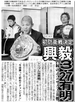 【2010年2月13日デイリースポーツ紙面より】 WBC世界フライ級王者・亀田興毅(23)=亀田=が12日、東京・水道橋の後楽園飯店で会見を行い、3月27日に有明コロシアムで初防衛戦を行うことを発表した。対戦相手はWBC同級暫定王者ポンサクレック・ウォンジョンカム(32)=タイ=で、王座統一戦を兼ねた初防衛戦となる。