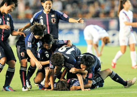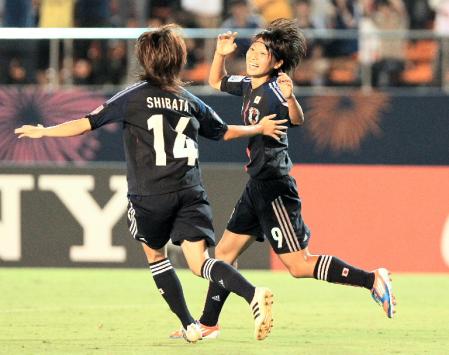 日本‐韓国 前半37分、ゴールを決め笑顔の田中陽(中央)=国立競技場(撮影・吉田敦史)