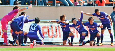 前半、鮮やかなボレーシュートで先制ゴールを決める佐藤(左)=撮影・開出 牧