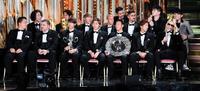 ベストイレブンに輝きEXILEのAKIRA(右)から表彰される横浜M・喜田拓也