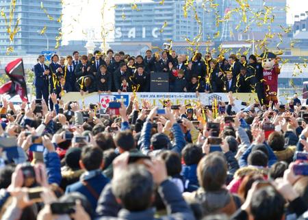 天皇杯で初優勝したJ1神戸の優勝報告会が2日、神戸市中央区のメリケンパークで行われ、トルステン・フィンク監督(52)や主将の元スペイン代表MFアンドレス・イニエスタ(35)ら全選手、スタッフが参加した。