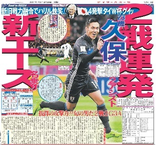 左FWでフル出場した原口元気(25)は1-0の後半35分に追加点となるゴールを挙げ、三浦知良、呂比須ワグナーを上回り、日本代表史上初となるW杯最終予選4試合連続ゴールを記録した。