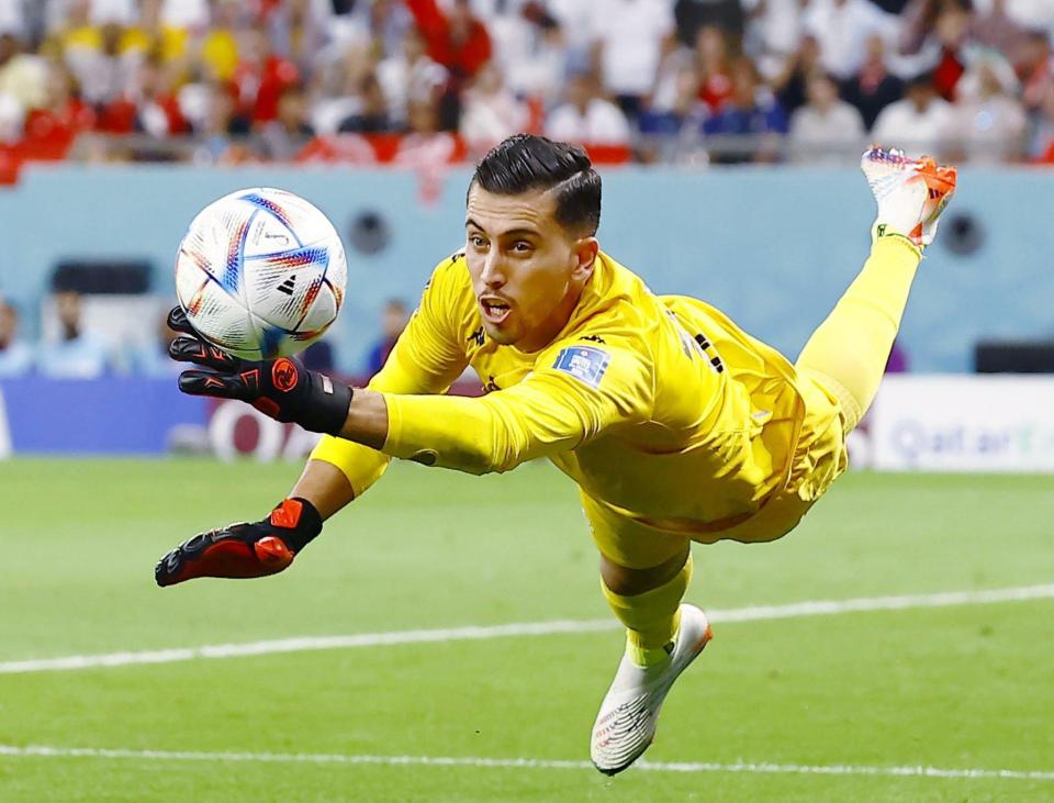 デンマーク-チュニジア 後半、ボールに飛びつくチュニジアのGKダハメン=アルラヤン(共同)