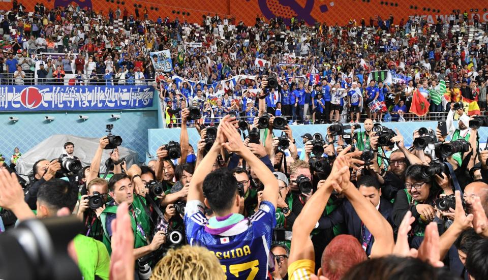 後半、田中碧の勝ち越しゴールに湧く日本(撮影・金田祐二)