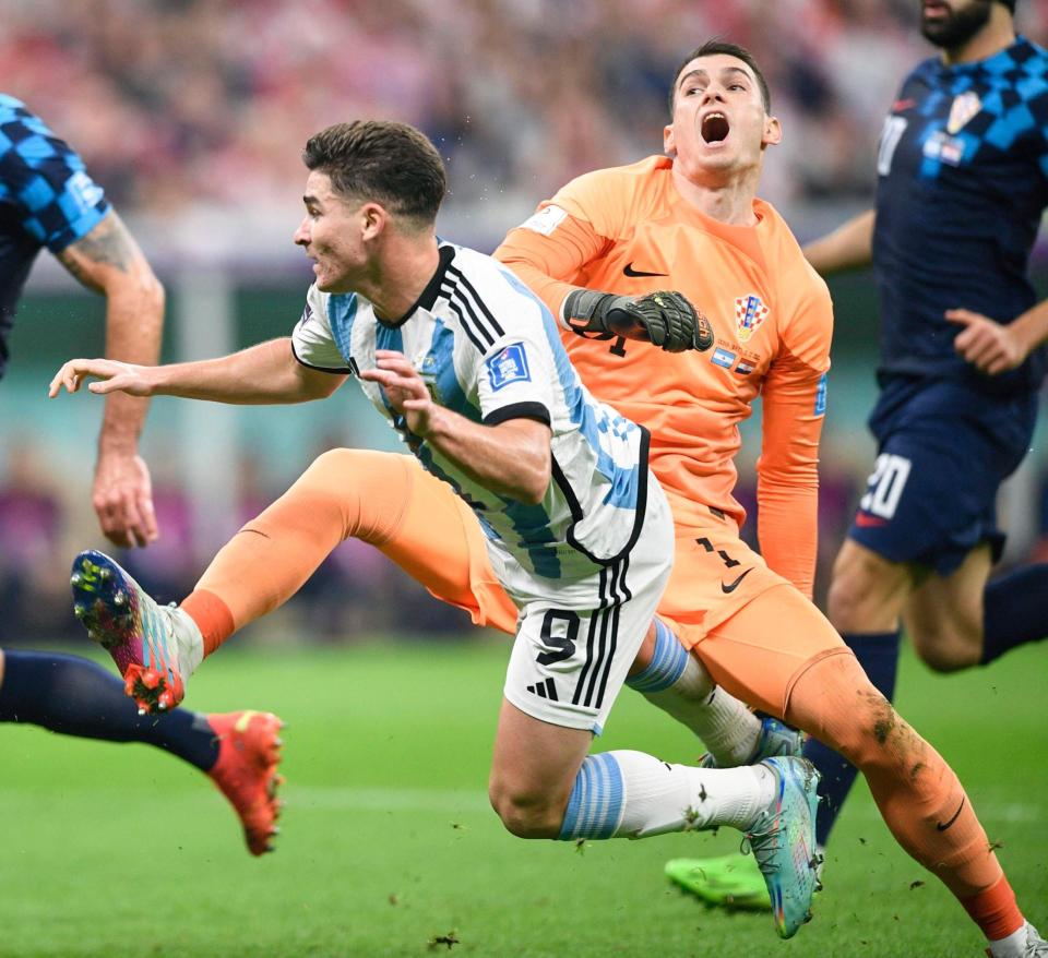 前半、クロアチアのGKリバコビッチ(奥)と交錯するアルゼンチンのアルバレス。先制のPKを獲得