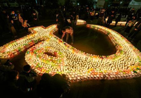 6434人が犠牲となった1995年の阪神大震災は17日、発生から31年となった。兵庫県内各地で追悼行事が開かれ、被災者や遺族らが発生時刻の午前5時46分に黙とうし、祈りをささげた。神戸市中央区の公園「東遊園地」では竹や紙の灯籠計約7千本に火がともり、記憶や教訓を語り継ぐ決意を込めた「1995 つむぐ 1・17」の文字が浮かび上がった。