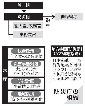 政府は6日、首相をトップとして災害発生時から復旧・復興までの司令塔機能を担う防災庁の設置関連法案を閣議決定した。2026年中の創設に向け、今国会での成立を目指す。本庁設置日は成立後に政令で定めるが、政府関係者によると11月の案がある。地方機関として「防災局」を27年度以降に設ける方向で調整。南海トラフ、日本海溝・千島海溝の両巨大地震などへの備えを強化する。