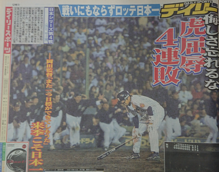 【懸賞付きQ8】2年ぶりに優勝した阪神タイガースだが、日本シリーズではロッテに4連敗。4試合の合計スコアは何対何?