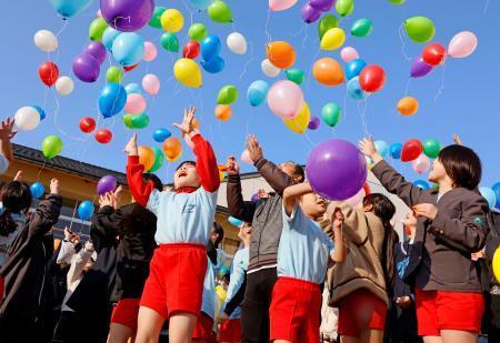 在校生が体育館で住民ら100人を前に、楽器の演奏や演劇、校歌を披露した。行事の最後には、校庭で色とりどりの風船を空に飛ばした。