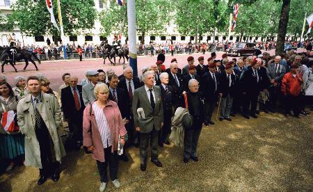 駐日大使の報告書によると、歓迎式典パレードで陛下とエリザベス女王がロンドンのバッキンガム宮殿近くの大通りを馬車で行進中、元捕虜たちは馬車に背を向けて「帰れ」などとやじを飛ばし、日本国旗が燃やされた。
