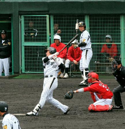 6回阪神2死、左線に二塁打を放つ阪神・新井貴浩(捕手・広島・石原 慶幸)=レクザム(撮影・山口 登)