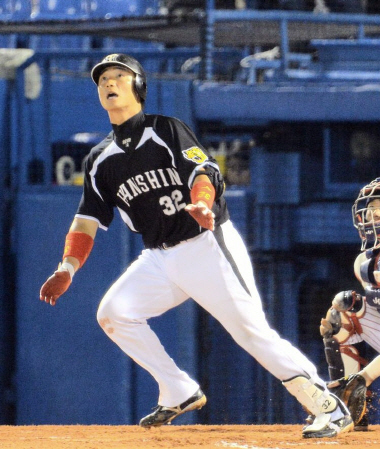 7回、新井良は左中間に満塁本塁打を放つ(撮影・金田祐二)