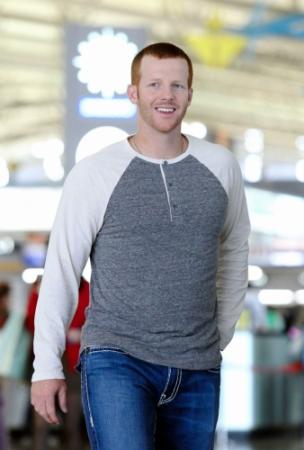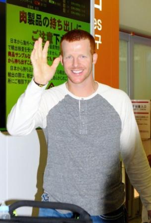 帰国前、報道陣の質問に答える阪神・マートン(中央)=関西国際空港(撮影・佐々木彰尚)