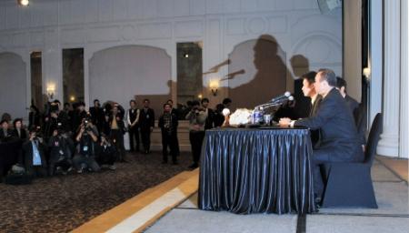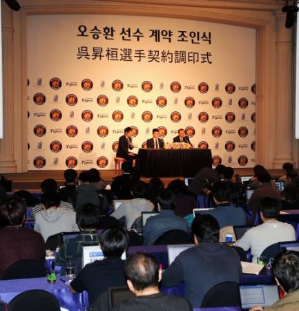 調印式を終え握手をする阪神・呉昇桓(左)と中村GM=ソウル市内のホテル(撮影・棚橋慶太)