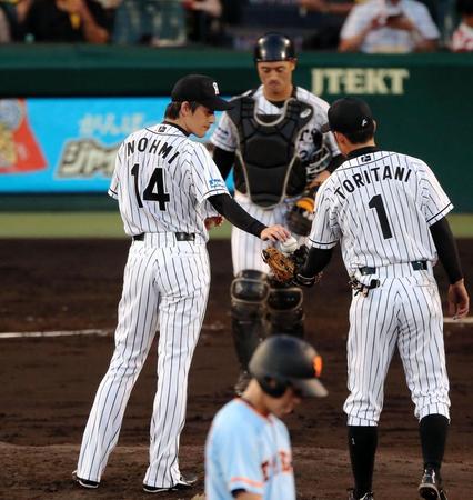 6点ビハインドとなった時点で一塁ベンチから金本監督が出て、交代を告げられた。