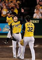 4回阪神、先制3ランを放つ原口=甲子園(撮影・田中太一)