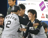 ハイタッチでナインを迎える岩貞(中央)=撮影・飯室逸平