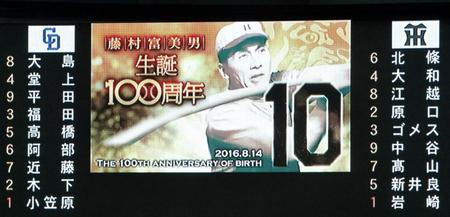 試合に先だって行われたセレモニーでは球場のオーロラビジョンで故人の栄光を振り返った。贈呈式で、鳥谷から花束と帽子を受け取った孫・藤村賢さんは「100周年ということで祖父の偉大さを感じた」と笑顔を見せた。