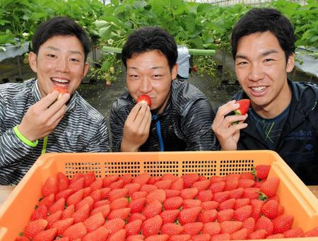 ルーキーたちがイチゴ狩り 「フルーツ好き」大山も歓喜