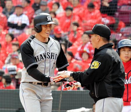 2点を追いかける三回2死で迎えた第2打席。広島先発・九里が投じた初球の148キロ直球系の球を右中間スタンドにライナーで突き刺した。「感触はよかったのですが、弾道が低かったので、『どうかな?』と思ったのですが、入ってくれてよかったです」と振り返った。