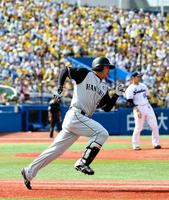 2回阪神無死、福留が右線ヒットを放つ=神宮球場(撮影・園田高夫)