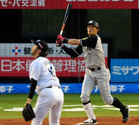 幕張の風に乗った打球は、美しい放物線を描きながら右翼スタンドへ。「打った感触も良かったですし、何より先制することができて良かったです」。27日・DeNA(甲子園)以来、2試合ぶりの豪快な一発だった。