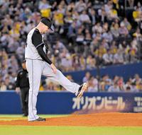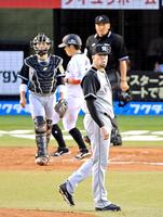 3点を失った1回を終え、悔しそうな表情でベンチに戻るメッセンジャー