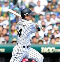 4回、左線へ同点適時を放つ阪神・原口文仁=甲子園(撮影・田中太一)