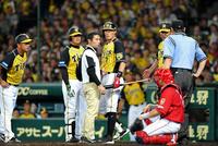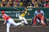 5回、空振りの後、右脇腹あたりをおさえる阪神・糸井