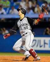4回、同点ソロを放った中谷(左)とタッチする大山=神宮球場(撮影・園田高夫)