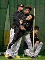 豆まきをする(奥左から)マテオ、モレノ=宜野座